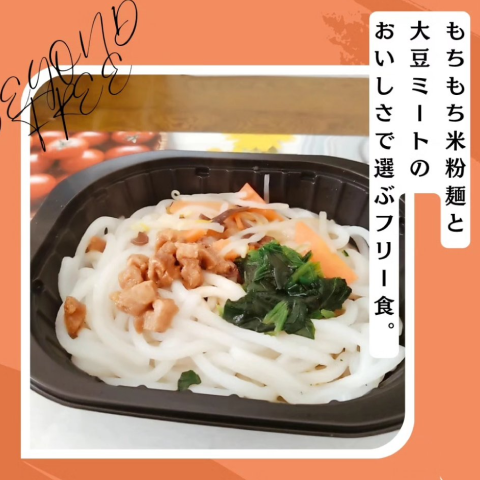 もちもちとした食感が楽しめる、独自開発の米粉麺と大豆ミートを使用した「米粉麺でつくった汁なし坦々麺 / 彩り野菜まぜそば」。