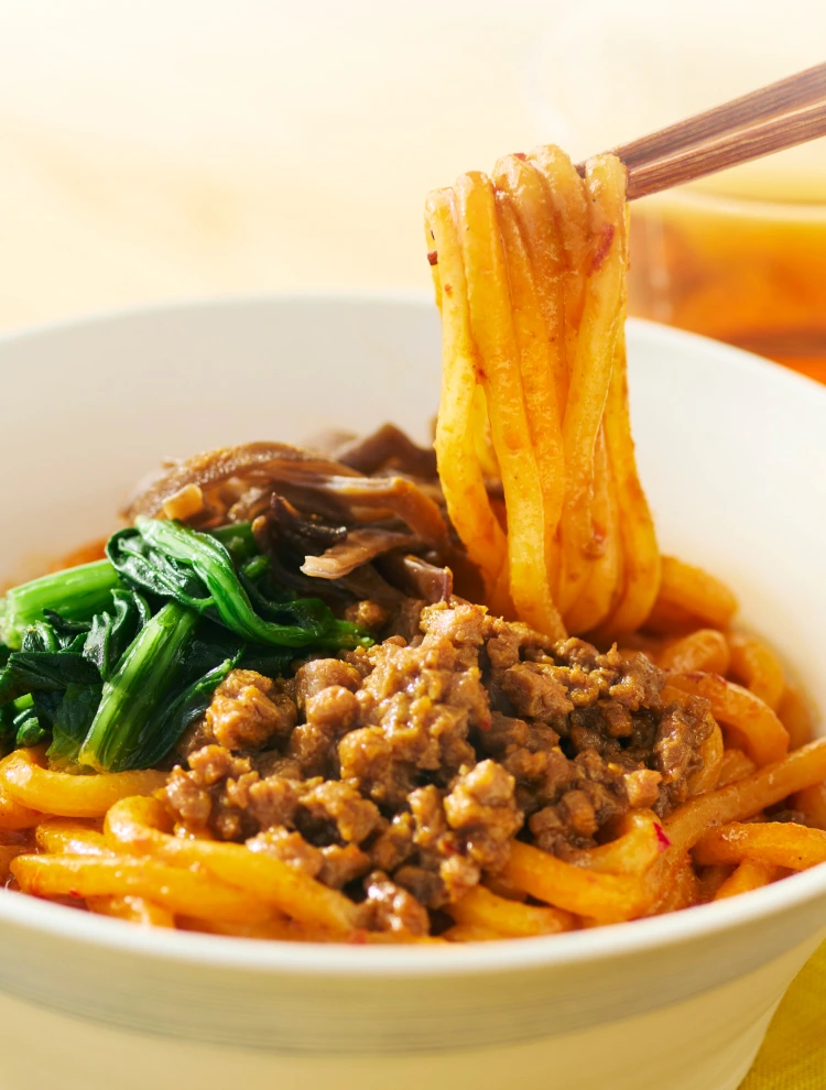 もちもちとした食感が楽しめる、独自開発の米粉麺と大豆ミートを使用した「米粉麺でつくった汁なし坦々麺 / 彩り野菜まぜそば」。