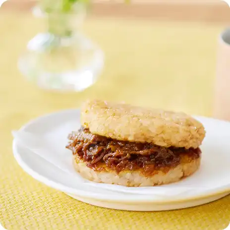 ミート 焼肉味醤油味のライスバンズで、焼肉味のプラントベースライスバーガーです。